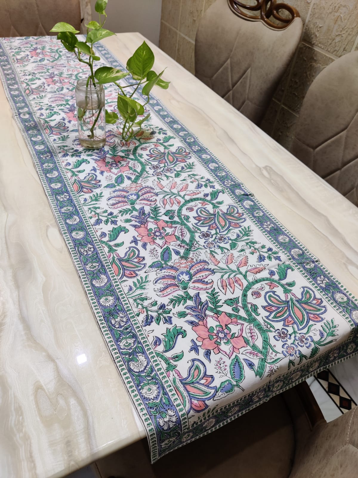 Spice up your dining table with elegant hand-crafted table runners which are block printed on canvas cotton base with border on sides.