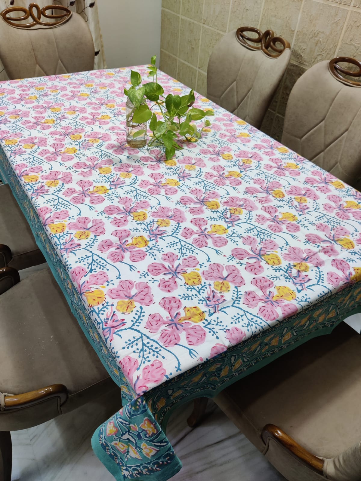 A gorgeous table cloth made with 100% cotton fabric is a must have to enhance the décor & ambience of your dining room. It features an elegant Indian Floral Block Print design in various colors and shades contrasting on a nice background with an extraordinary border pattern all around. This 100% cotton table cloth is a perfect fit and a necessary essential to compliment the décor of your dining ensemble.