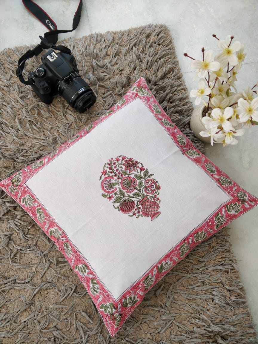 Pure cotton cushion covers. Flower Pot Design Cotton Cushion Covers are block printed on a white base with red bel border. Zip closure for easy use, durable cotton fabric for easy care.