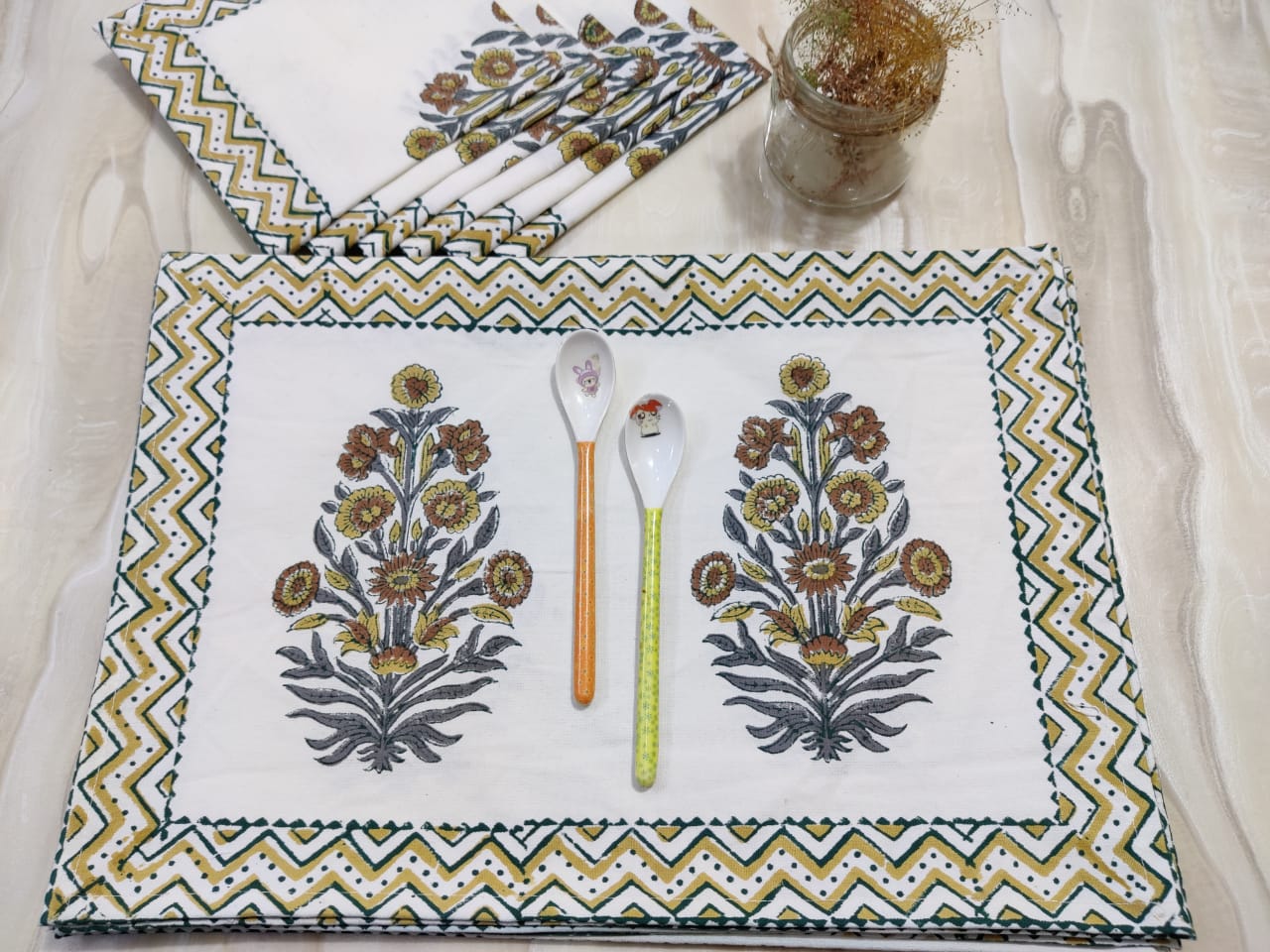 Golden Buta Design Placemats are caves cotton block printed in white base with a lovely border