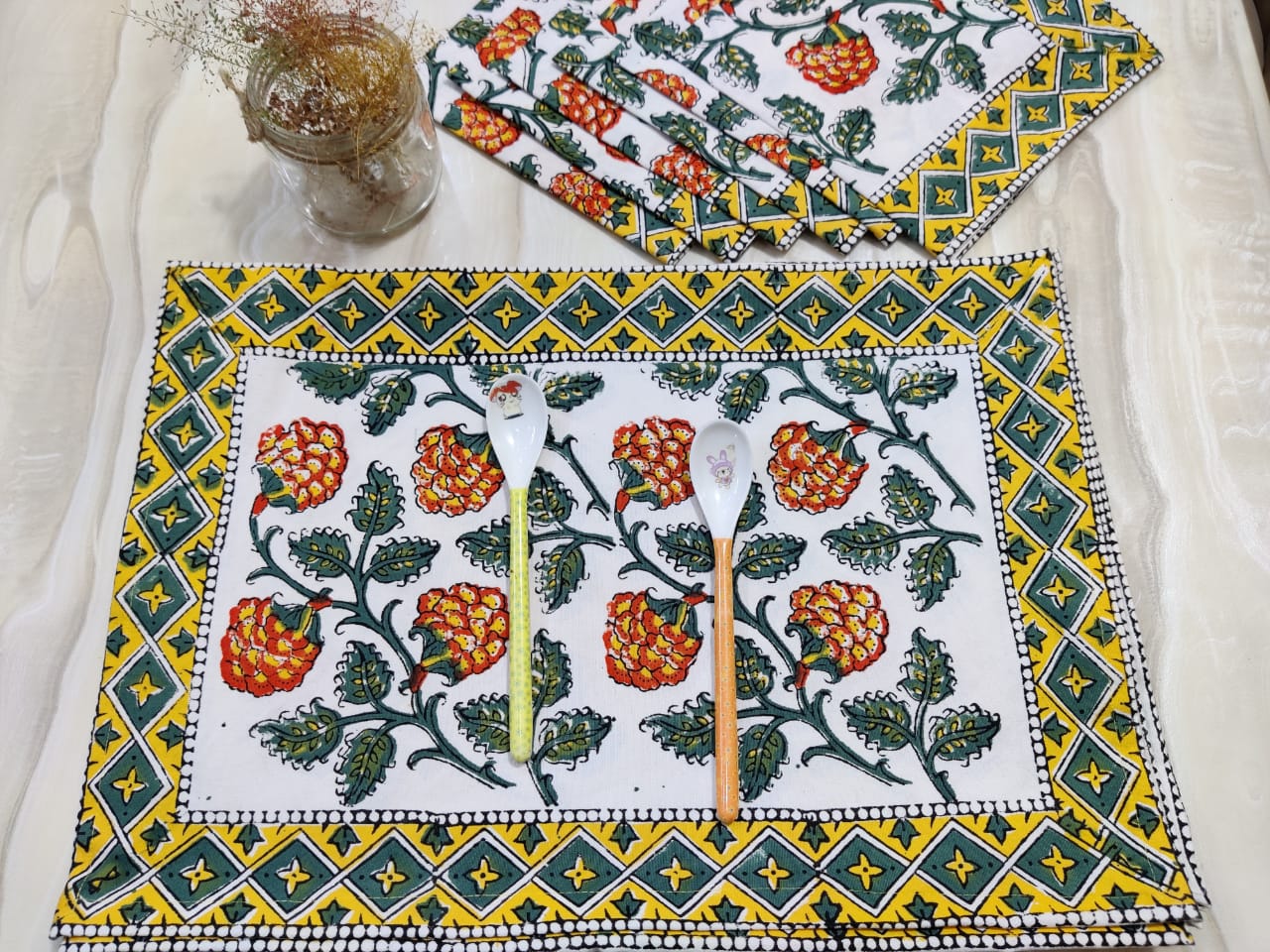 Yellow Berries Print Placemats are block printed canvas cotton placemats inspired by nature with a border.